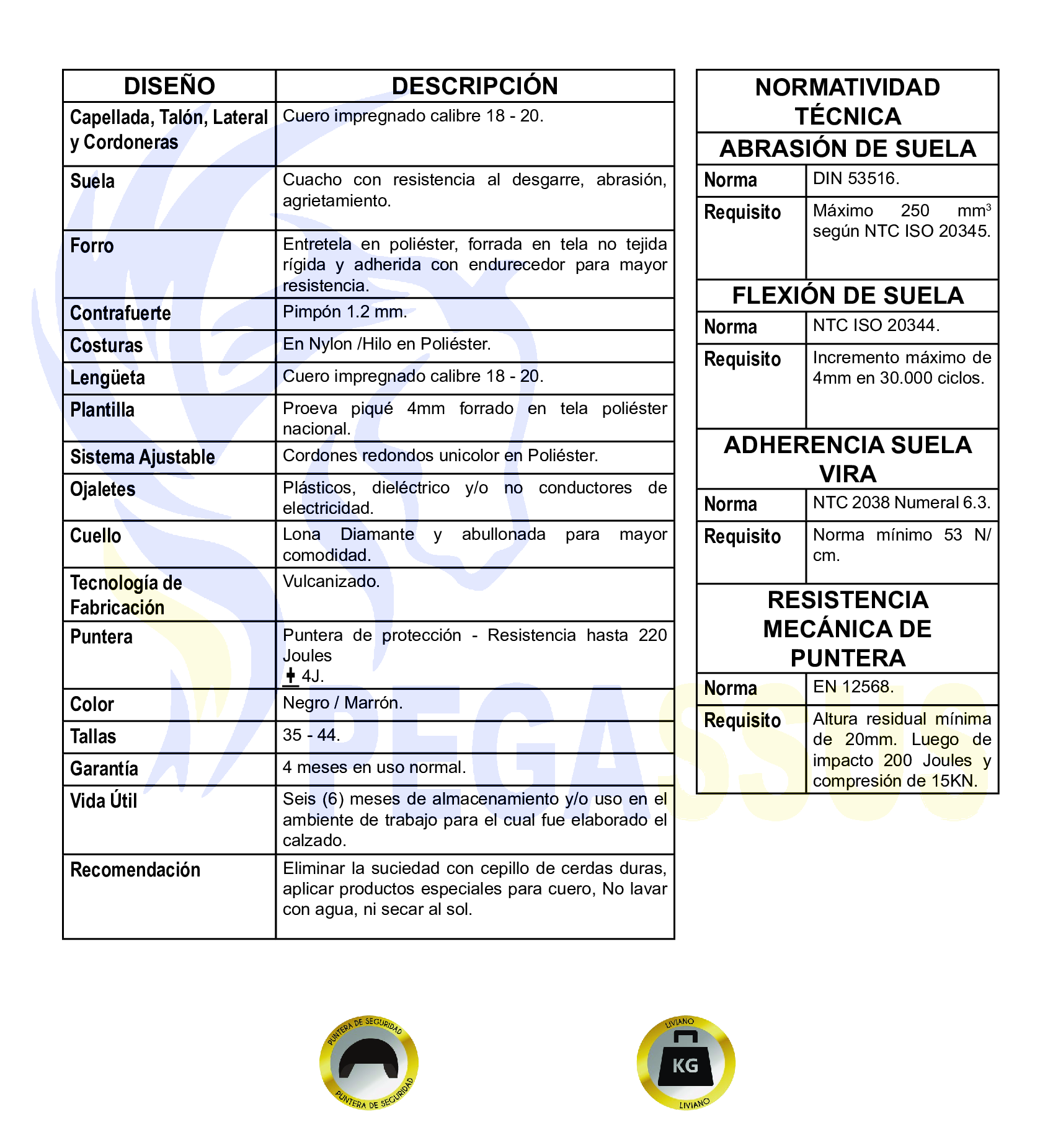 Suela: Cuacho con resistencia al desgarre, abrasión, agrietamiento. Antideslizante. Plantilla: Proeva 4mm forrado en tela poliéster nacional.
