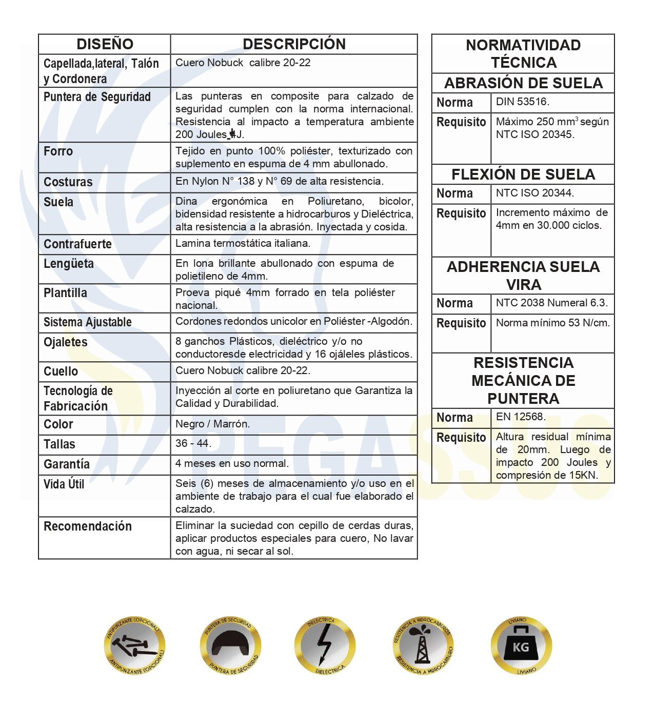 Vida útil: Seis (6) meses en almacenamiento y/o uso en el ambiente de trabajo para el cual fue elaborado el calzado.